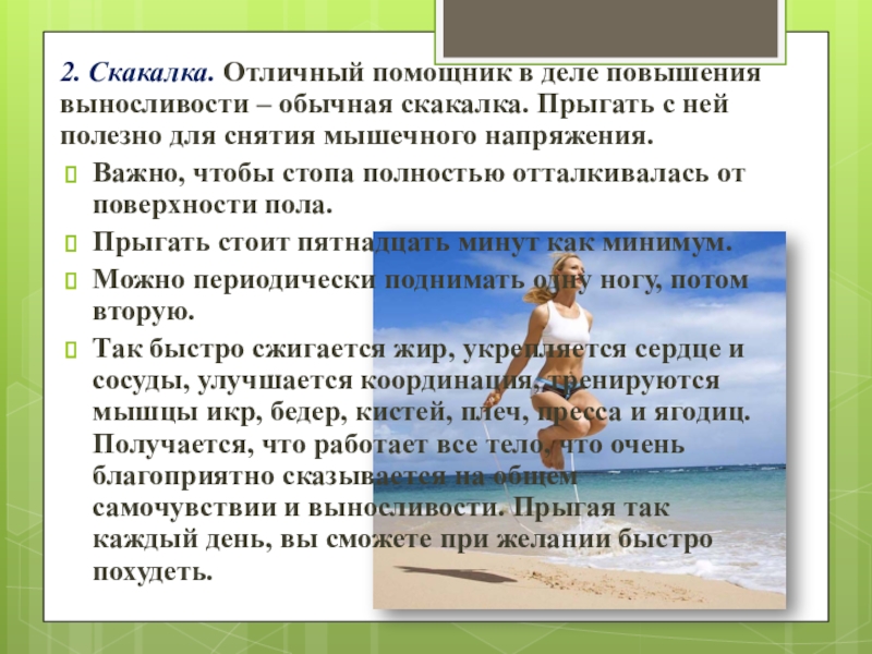Слайд 72. Скакалка. Отличный помощник в деле повышения выносливости – обычная скакалка.