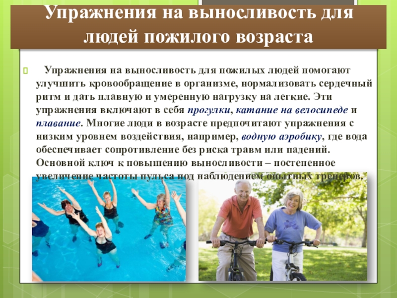 для пожилых людей помогают улучшить кровообращение в организме, нормализовать сердечный ритм и дать плавную и умеренную нагрузку на легкие. Эти упражнения включают в себя прогулки, катание на велосипеде и плавание. Многие люди в возрасте предпочитают упражнения с низким уровнем воздействия, например, водную аэробику, где вода обеспечивает сопротивление без риска травм или падений. Основной ключ к повышению выносливости – постепенное увеличение частоты пульса под наблюдением опытных тренеров.