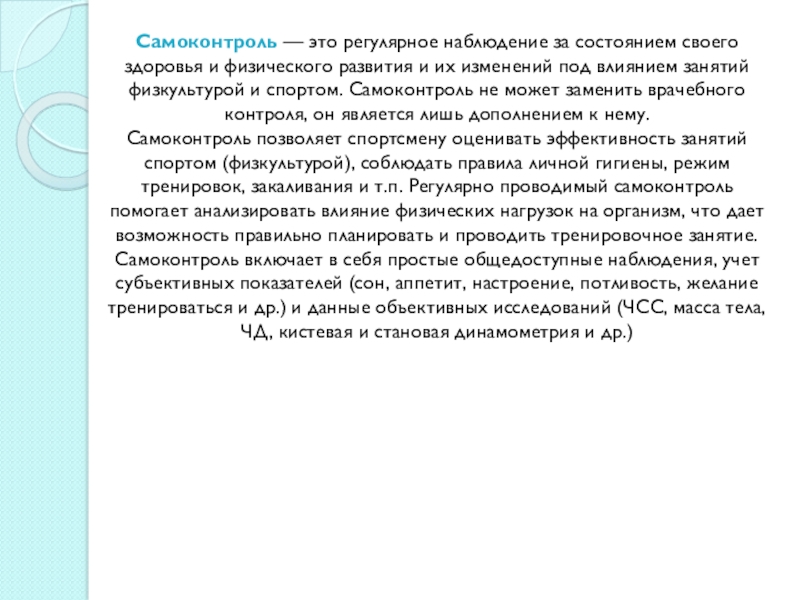 Слайд 16Самоконтроль — это регулярное наблюдение за состоянием своего здоровья и физического