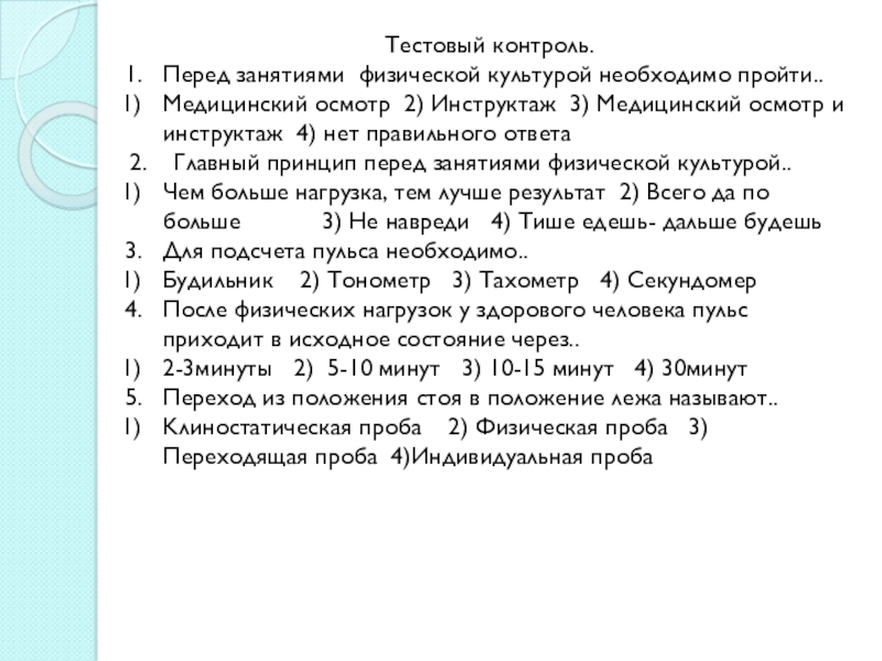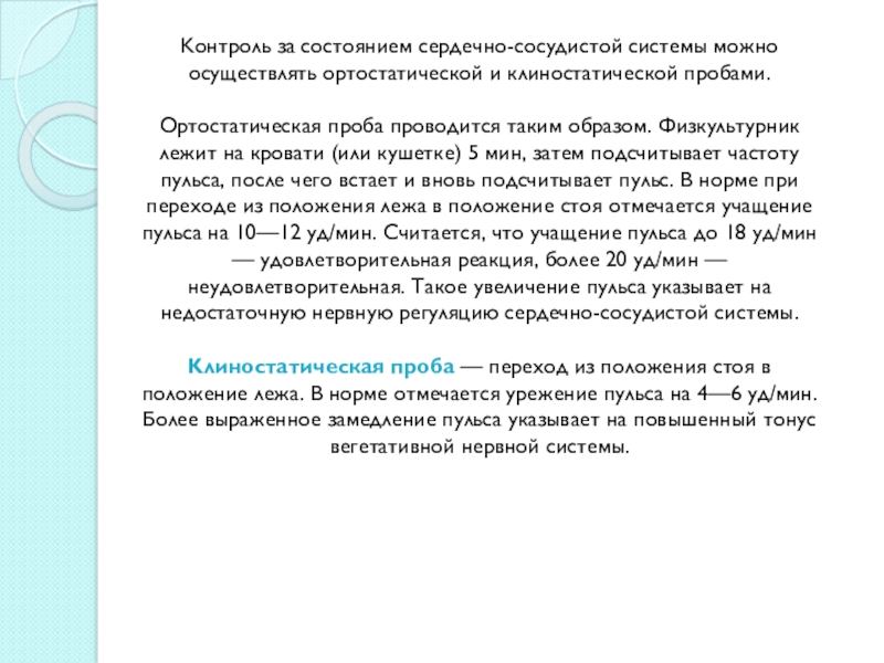 Слайд 11Kонтроль за состоянием сердечно-сосудистой системы можно осуществлять ортостатической и клиностатической пробами.