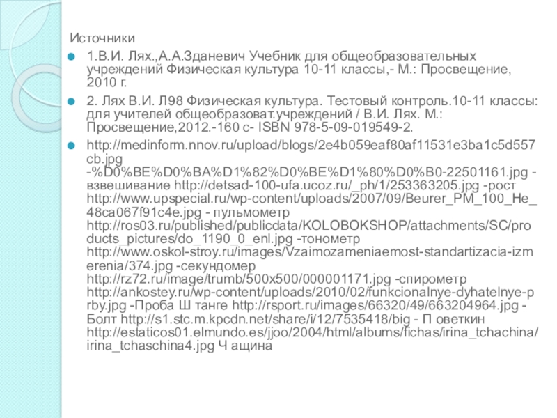 2. Лях В.И. Л98 Физическая культура. Тестовый контроль.10-11 классы: для учителей общеобразоват.учреждений / В.И. Лях. М.: Просвещение,2012.-160 с- ISBN 978-5-09-019549-2.