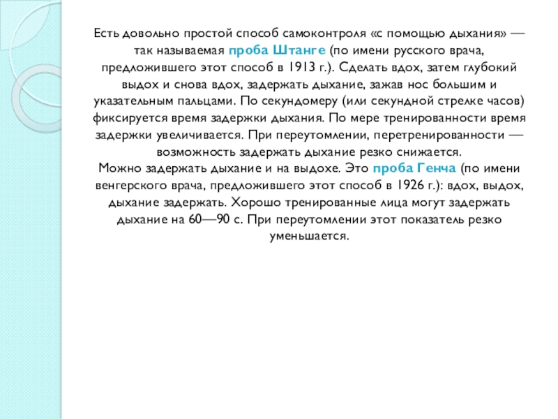 Можно задержать дыхание и на выдохе. Это проба Генча (по имени венгерского врача, предложившего этот способ в 1926 г.): вдох, выдох, дыхание задержать. Хорошо тренированные лица могут задержать дыхание на 60—90 с. При переутомлении этот показатель резко уменьшается.