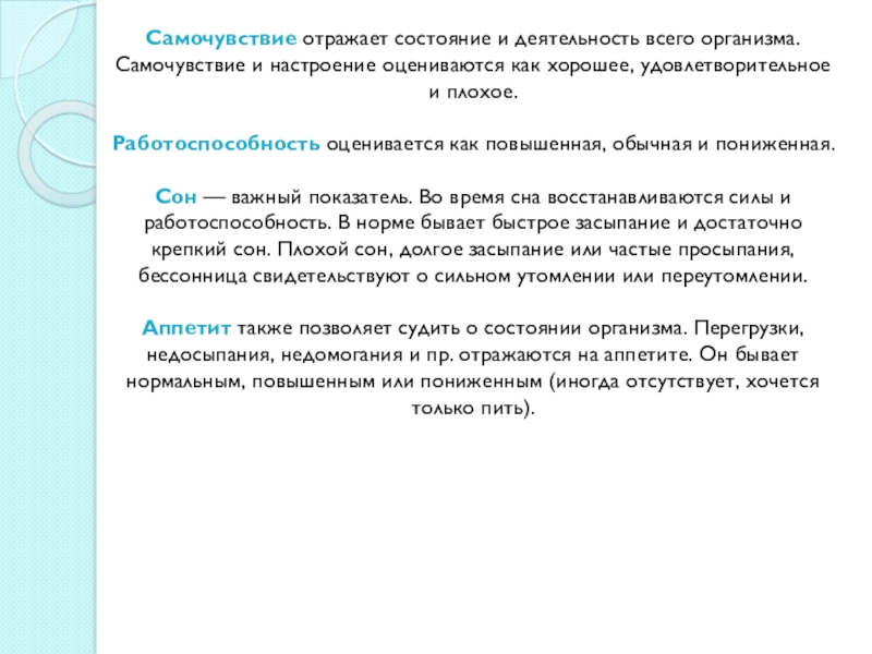 Слайд 17Самочувствие отражает состояние и деятельность всего организма. Самочувствие и настроение оцениваются