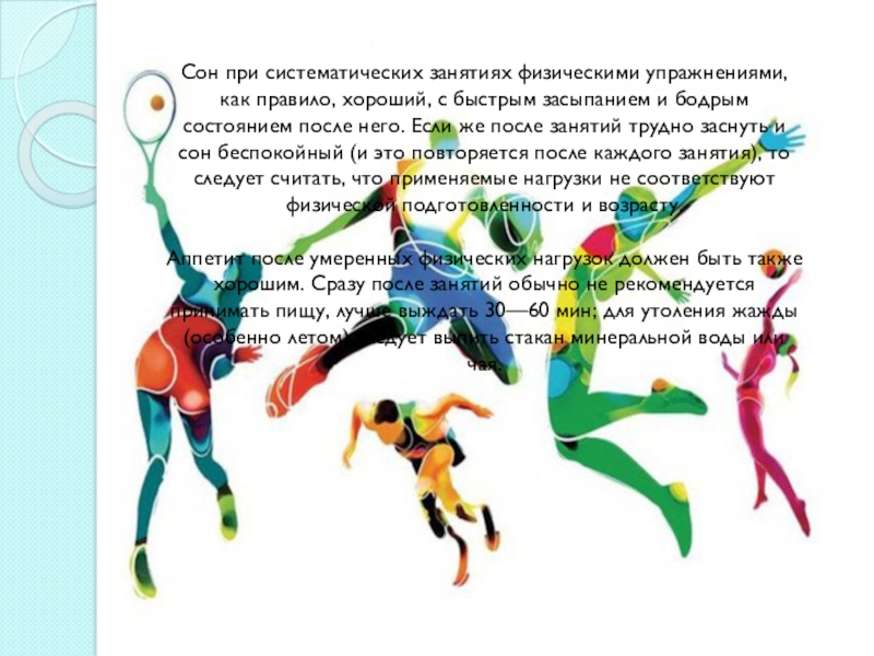 Слайд 6Сон при систематических занятиях физическими упражнениями, как правило, хороший, с быстрым