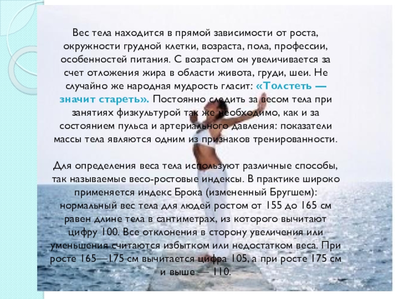 возраста, пола, профессии, особенностей питания. С возрастом он увеличивается за счет отложения жира в области живота, груди, шеи. Не случайно же народная мудрость гласит: «Толстеть — значит стареть». Постоянно следить за весом тела при занятиях физкультурой так же необходимо, как и за состоянием пульса и артериального давления: показатели массы тела являются одним из признаков тренированности.