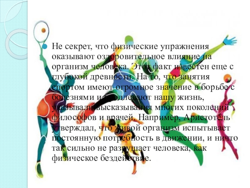 Этот факт известен еще с глубокой древности. На то, что занятия спортом имеют огромное значение в борьбе с болезнями и продлевают нашу жизнь, указывали высказывания многих поколений философов и врачей. Например, Аристотель утверждал, что живой организм испытывает постоянную потребность в движении, и ничто так сильно не разрушает человека, как физическое бездействие.