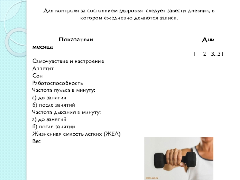 Слайд 15Для контроля за состоянием здоровья следует завести дневник, в котором ежедневно