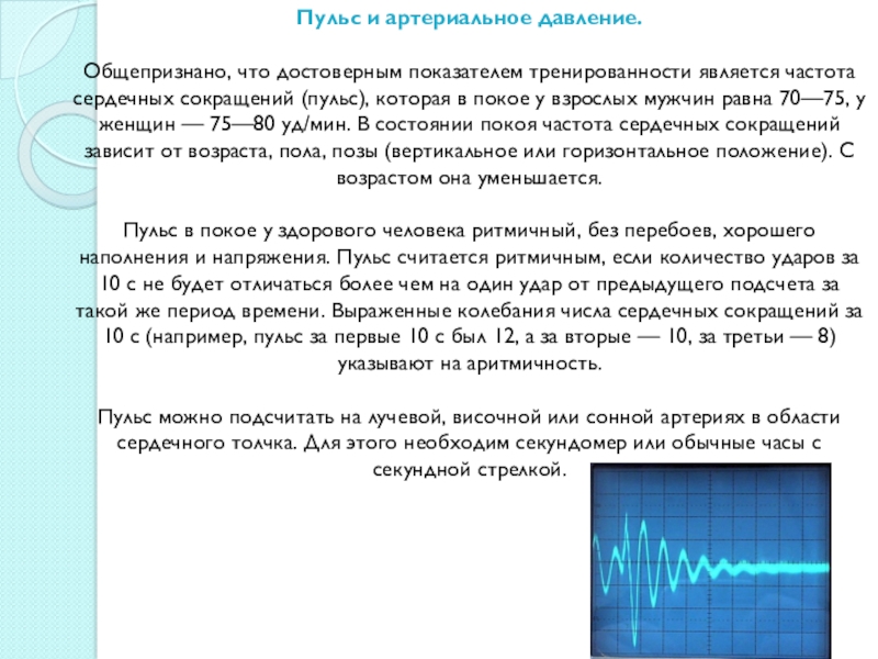 Частота сердечных сокращений (ЧСС) — важный объективный показатель работы сердечно-сосудистой системы. Пульс в состоянии покоя у тренированного человека ниже, чем у нетренированного. Пульс подсчитывают за 15 с, но если имеется нарушение его ритма, то подсчитывают за одну минуту. Чем тренированнее человек, тем быстрее его пульс приходит к норме после тренировки. Утром у тренированного спортсмена он слабее.