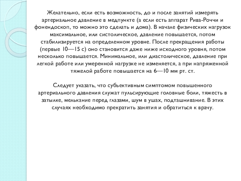 Слайд 12Желательно, если есть возможность, до и после занятий измерять артериальное давление