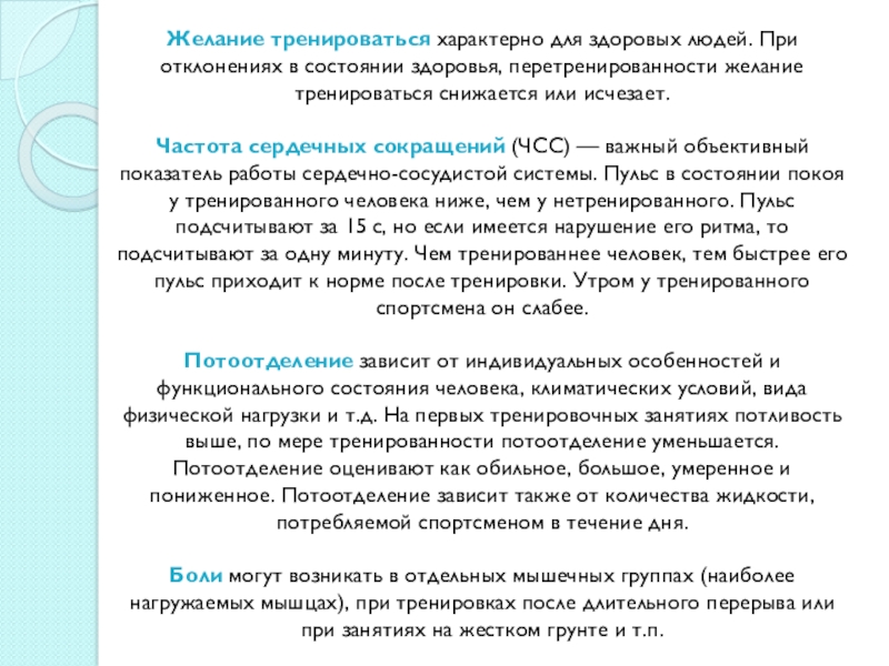 Слайд 18Желание тренироваться характерно для здоровых людей. При отклонениях в состоянии здоровья,