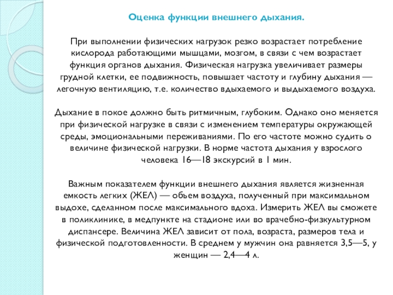 Важным показателем функции внешнего дыхания является жизненная емкость легких (ЖЕЛ) — объем воздуха, полученный при максимальном выдохе, сделанном после максимального вдоха. Измерить ЖЕЛ вы сможете в поликлинике, в медпункте на стадионе или во врачебно-физкультурном диспансере. Величина ЖЕЛ зависит от пола, возраста, размеров тела и физической подготовленности. В среднем у мужчин она равняется 3,5—5, у женщин — 2,4—4 л.