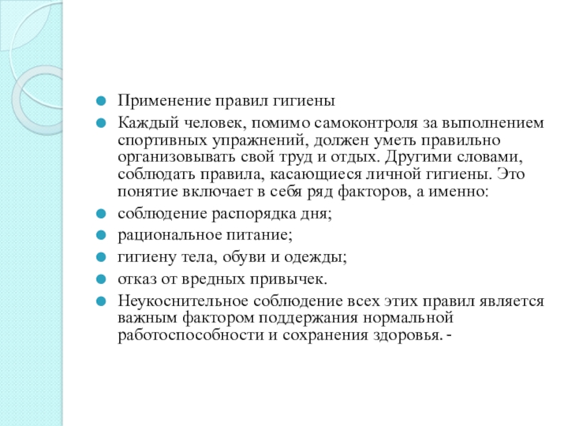 должен уметь правильно организовывать свой труд и отдых. Другими словами, соблюдать правила, касающиеся личной гигиены. Это понятие включает в себя ряд факторов, а именно: