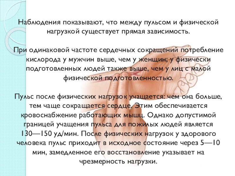 Слайд 9Наблюдения показывают, что между пульсом и физической нагрузкой существует прямая зависимость.
