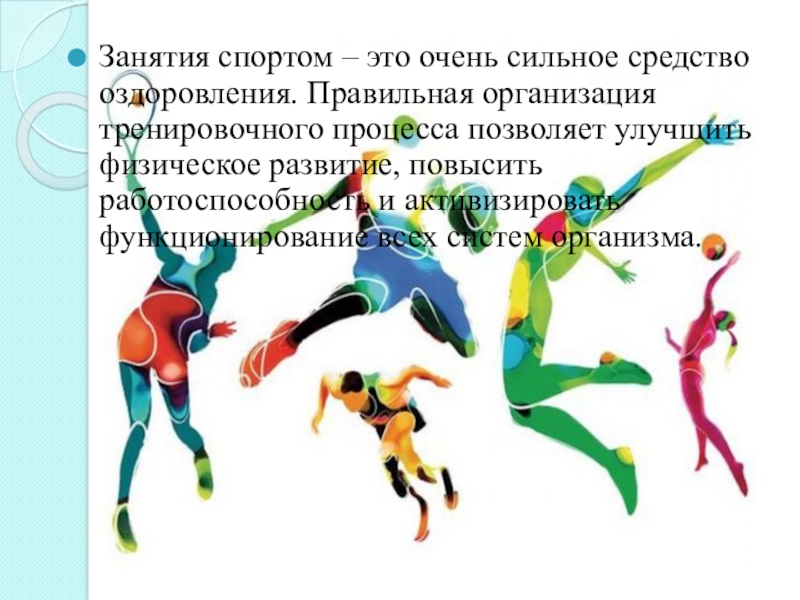 Слайд 3Занятия спортом – это очень сильное средство оздоровления. Правильная организация тренировочного