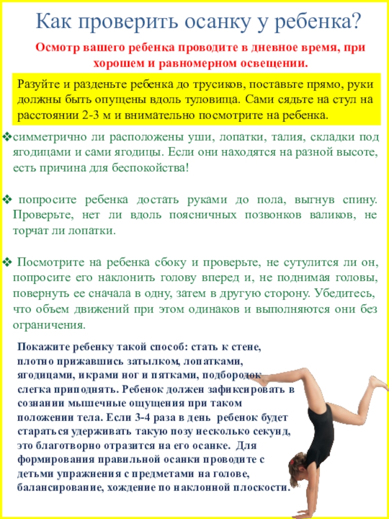 Контролируйте осанку своего ребенка раз в пол года самостоятельно, не прибегая к помощи врача.
