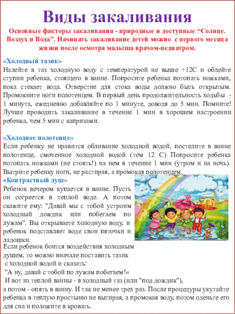 Основные факторы закаливания - природные и доступные “Солнце. Воздух и Вода”. Начинать закаливание детей можно с первого месяца жизни после осмотра малыша врачом-педиатром.