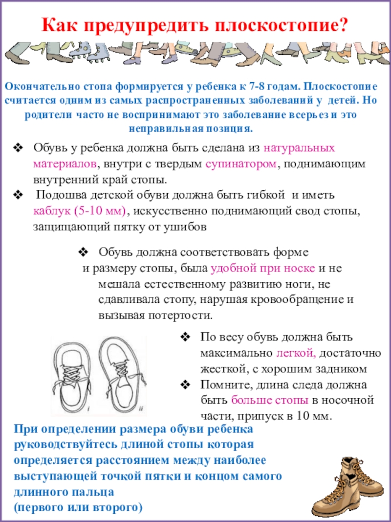 Подошва детской обуви должна быть гибкой и иметь каблук (5-10 мм), искусственно поднимающий свод стопы, защищающий пятку от ушибов