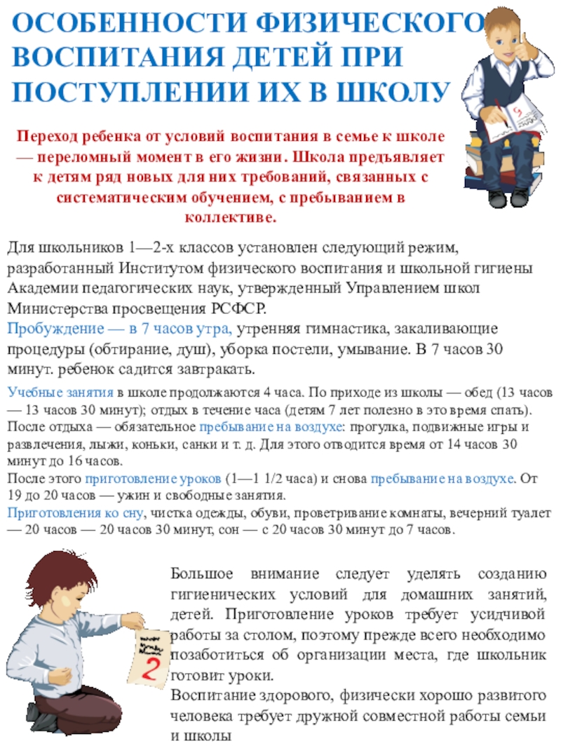 Для школьников 1—2-х классов установлен следующий режим, разработанный Институтом физического воспитания и школьной гигиены Академии педагогических наук, утвержденный Управлением школ Министерства просвещения РСФСР.