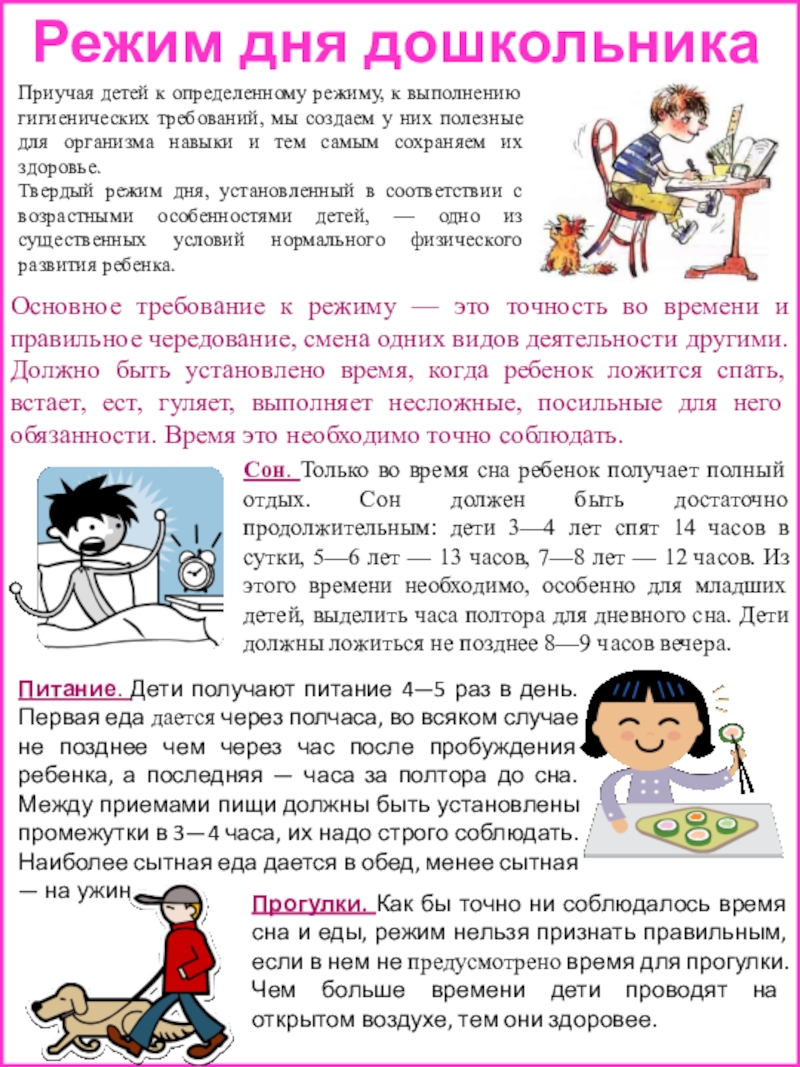 Основное требование к режиму — это точность во времени и правильное чередование, смена одних видов деятельности другими.