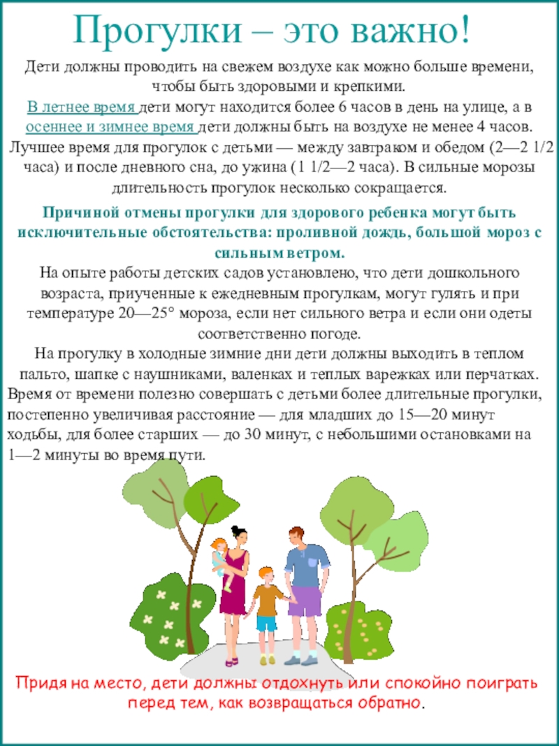 Придя на место, дети должны отдохнуть или спокойно поиграть перед тем, как возвращаться обратно.