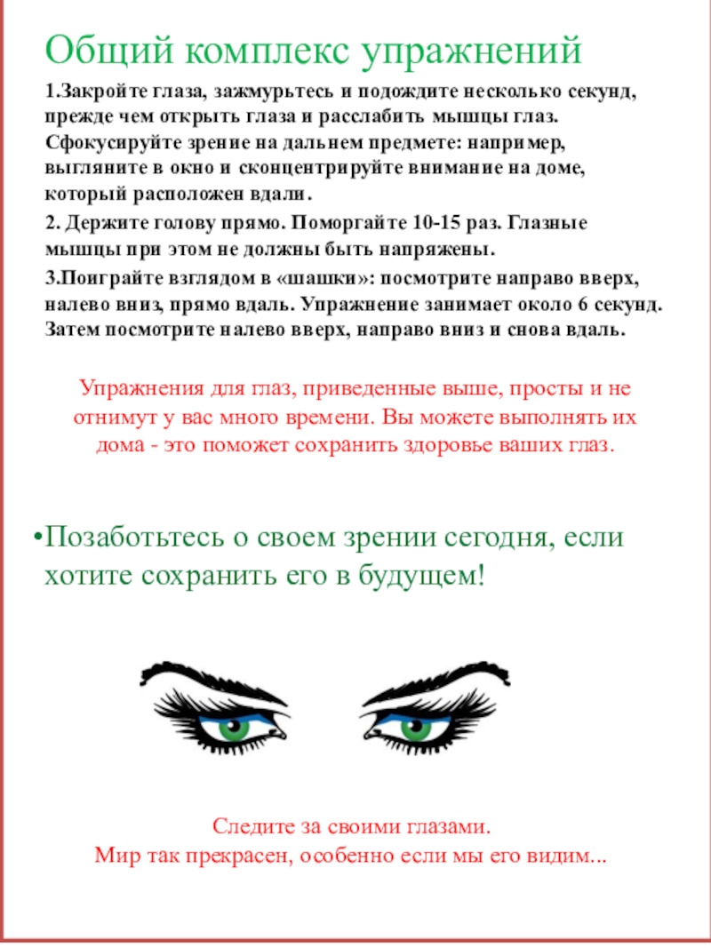 Упражнения для глаз, приведенные выше, просты и не отнимут у вас много времени. Вы можете выполнять их дома - это поможет сохранить здоровье ваших глаз.