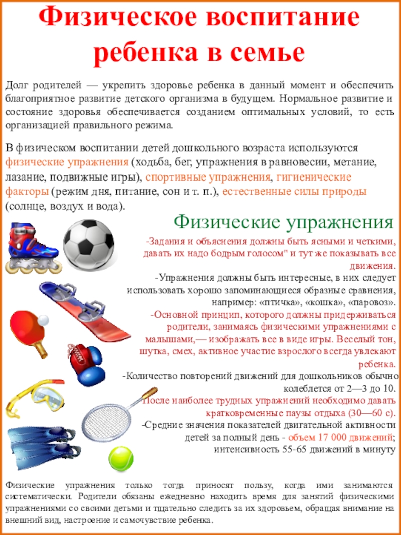Физические упражнения только тогда приносят пользу, когда ими занимаются систематически. Родители обязаны ежедневно находить время для занятий физическими упражнениями со своими детьми и тщательно следить за их здоровьем, обращая внимание на внешний вид, настроение и самочувствие ребенка.