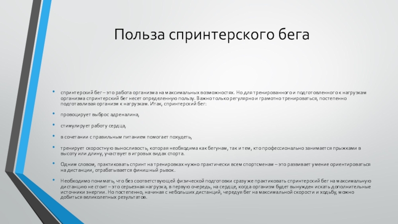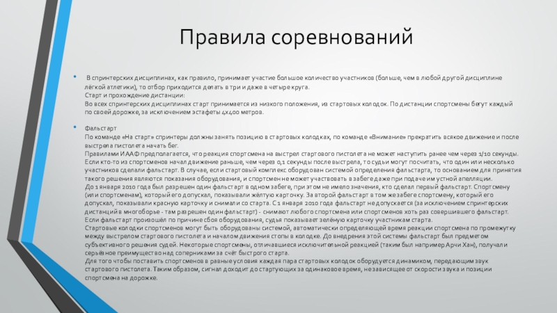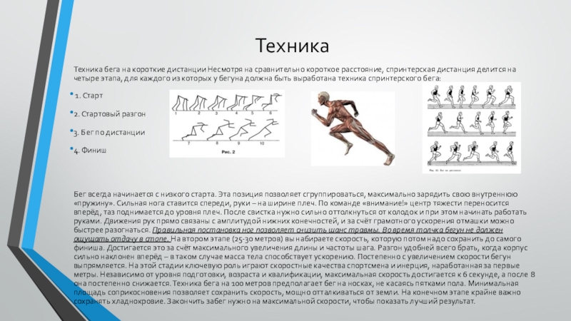 Техника бега на короткие дистанции Несмотря на сравнительно короткое расстояние, спринтерская дистанция делится на четыре этапа, для каждого из которых у бегуна должна быть выработана техника спринтерского бега: