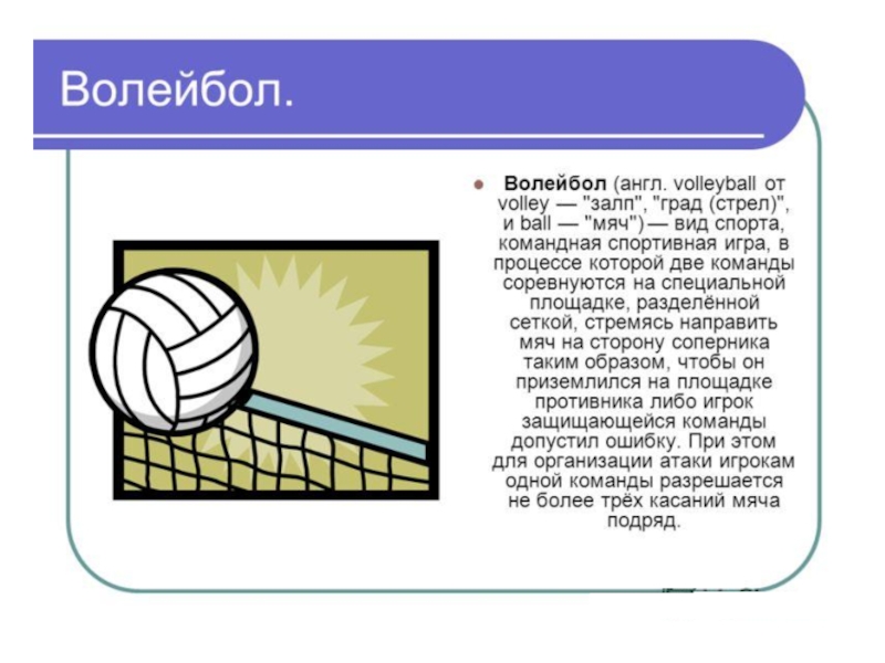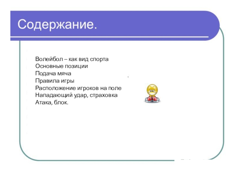 Волейбол – как вид спортаОсновные позицииПодача мячаПравила игрыРасположение игроков на полеНападающий удар, страховкаАтака, блок.
