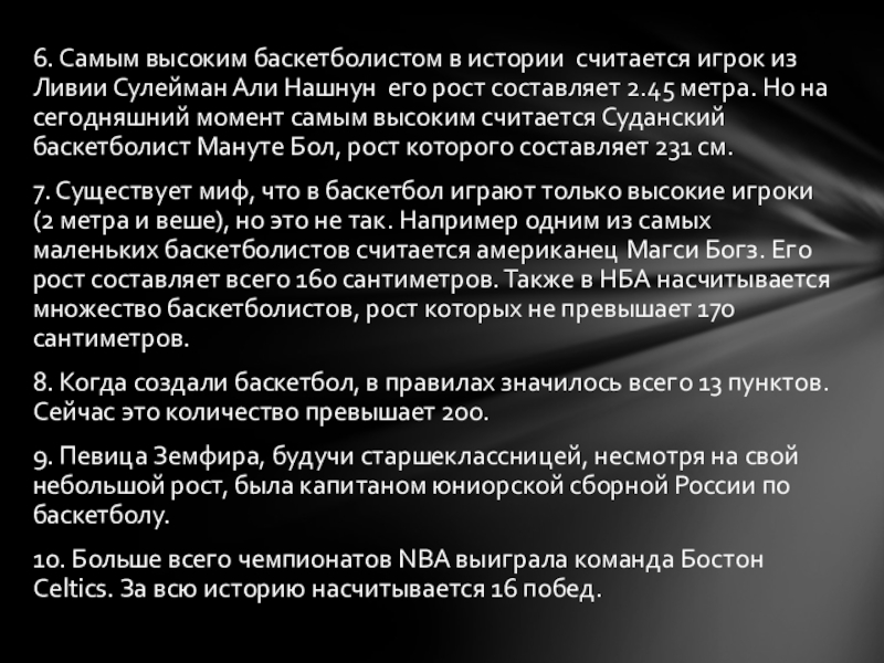 Слайд 136. Самым высоким баскетболистом в истории считается игрок из Ливии Сулейман