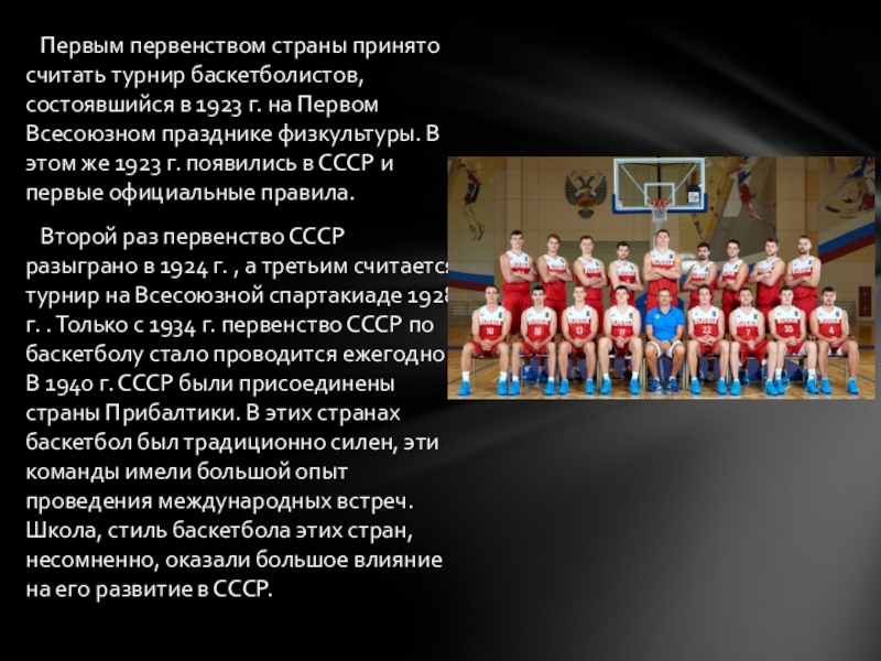 Слайд 11 Первым первенством страны принято считать турнир баскетболистов, состоявшийся в