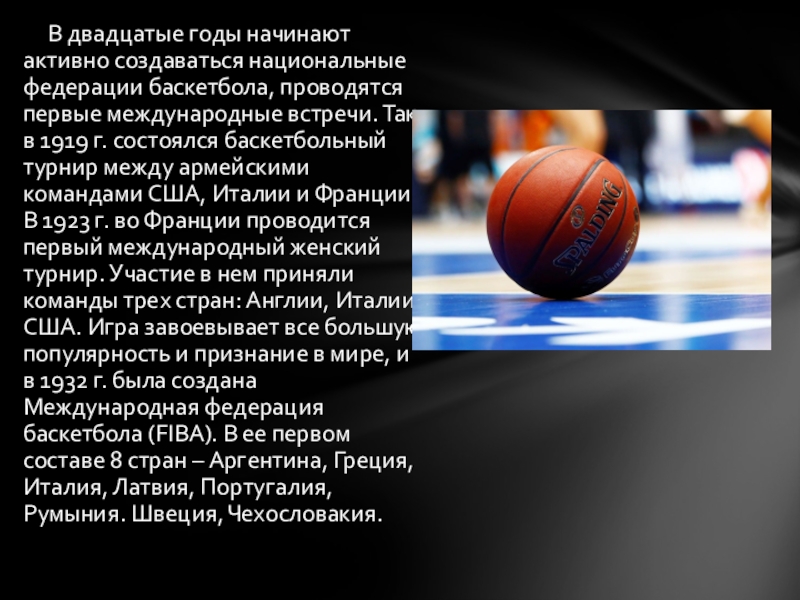 баскетбола, проводятся первые международные встречи. Так в 1919 г. состоялся баскетбольный турнир между армейскими командами США, Италии и Франции. В 1923 г. во Франции проводится первый международный женский турнир. Участие в нем приняли команды трех стран: Англии, Италии, США. Игра завоевывает все большую популярность и признание в мире, и в 1932 г. была создана Международная федерация баскетбола (FIBA). В ее первом составе 8 стран – Аргентина, Греция, Италия, Латвия, Португалия, Румыния. Швеция, Чехословакия.