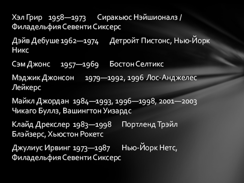 Слайд 15Хэл Грир 1958—1973 Сиракьюс Нэйшионалз / Филадельфия Севенти Сиксерс