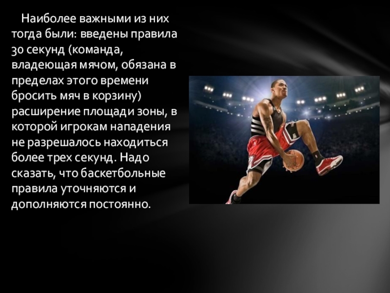30 секунд (команда, владеющая мячом, обязана в пределах этого времени бросить мяч в корзину) расширение площади зоны, в которой игрокам нападения не разрешалось находиться более трех секунд. Надо сказать, что баскетбольные правила уточняются и дополняются постоянно.