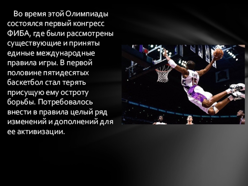где были рассмотрены существующие и приняты единые международные правила игры. В первой половине пятидесятых баскетбол стал терять присущую ему остроту борьбы. Потребовалось внести в правила целый ряд изменений и дополнений для ее активизации.