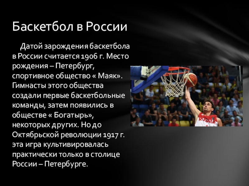 Слайд 9 Датой зарождения баскетбола в России считается 1906 г.
