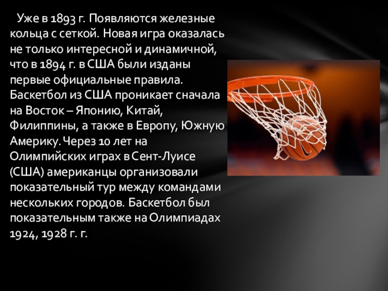 Новая игра оказалась не только интересной и динамичной, что в 1894 г. в США были изданы первые официальные правила. Баскетбол из США проникает сначала на Восток – Японию, Китай, Филиппины, а также в Европу, Южную Америку. Через 10 лет на Олимпийских играх в Сент-Луисе (США) американцы организовали показательный тур между командами нескольких городов. Баскетбол был показательным также на Олимпиадах 1924, 1928 г. г.