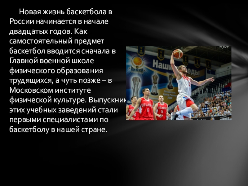 двадцатых годов. Как самостоятельный предмет баскетбол вводится сначала в Главной военной школе физического образования трудящихся, а чуть позже – в Московском институте физической культуре. Выпускники этих учебных заведений стали первыми специалистами по баскетболу в нашей стране.