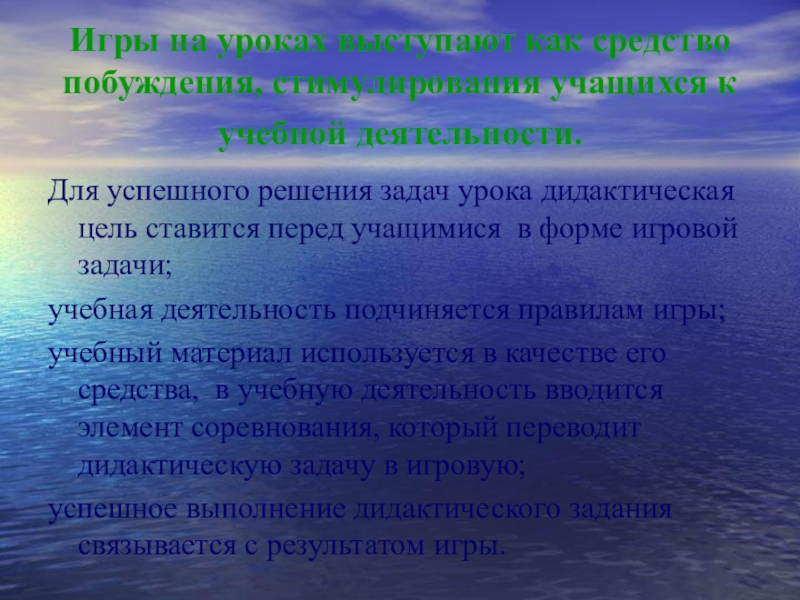 Для успешного решения задач урока дидактическая цель ставится перед учащимися в форме игровой задачи;