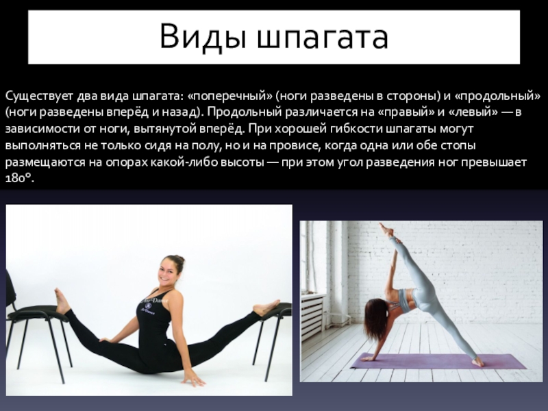 «продольный» (ноги разведены вперёд и назад). Продольный различается на «правый» и «левый» — в зависимости от ноги, вытянутой вперёд. При хорошей гибкости шпагаты могут выполняться не только сидя на полу, но и на провисе, когда одна или обе стопы размещаются на опорах какой-либо высоты — при этом угол разведения ног превышает 180°.