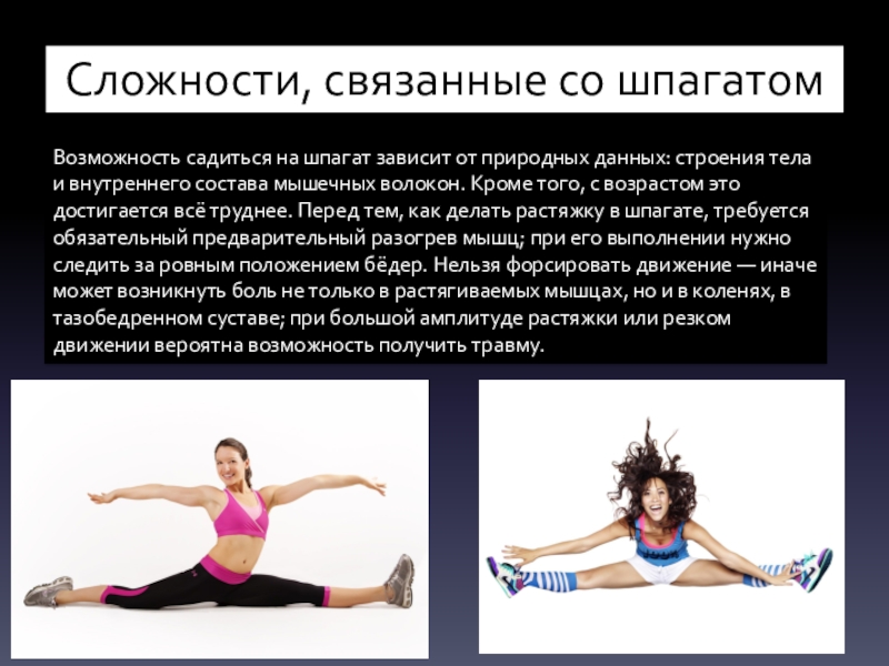 строения тела и внутреннего состава мышечных волокон. Кроме того, с возрастом это достигается всё труднее. Перед тем, как делать растяжку в шпагате, требуется обязательный предварительный разогрев мышц; при его выполнении нужно следить за ровным положением бёдер. Нельзя форсировать движение — иначе может возникнуть боль не только в растягиваемых мышцах, но и в коленях, в тазобедренном суставе; при большой амплитуде растяжки или резком движении вероятна возможность получить травму.