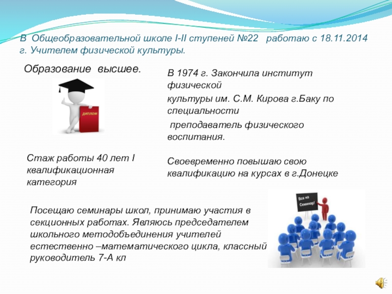 Посещаю семинары школ, принимаю участия в секционных работах. Являюсь председателем школьного методобъединения учителей естественно –математического цикла, классный руководитель 7-А кл