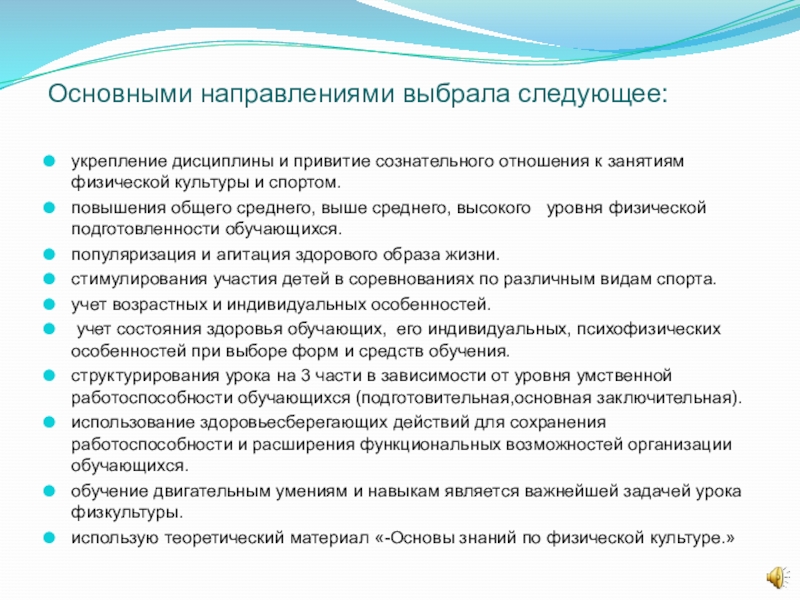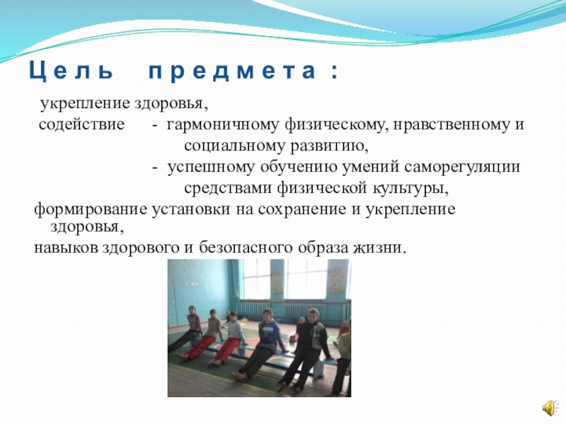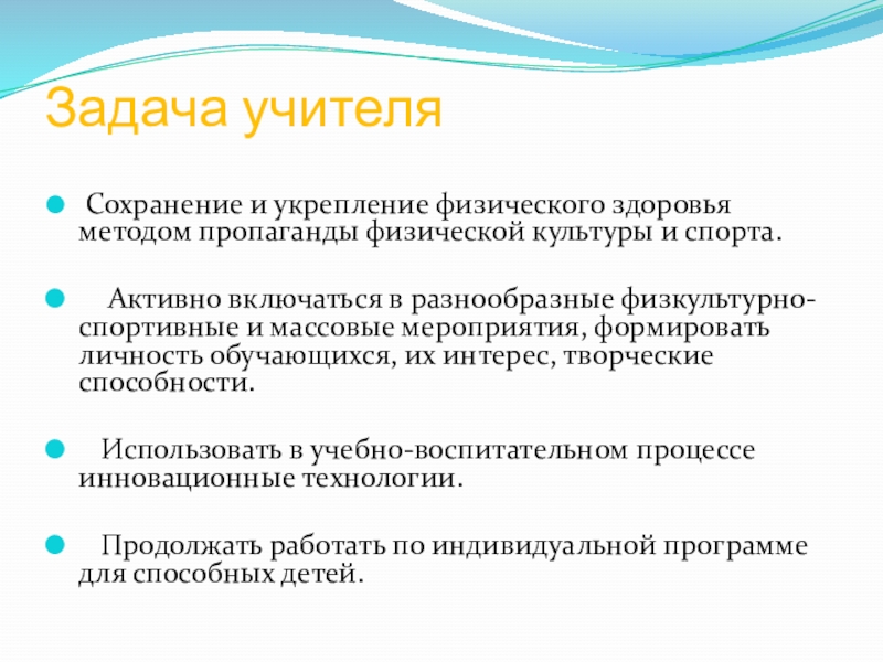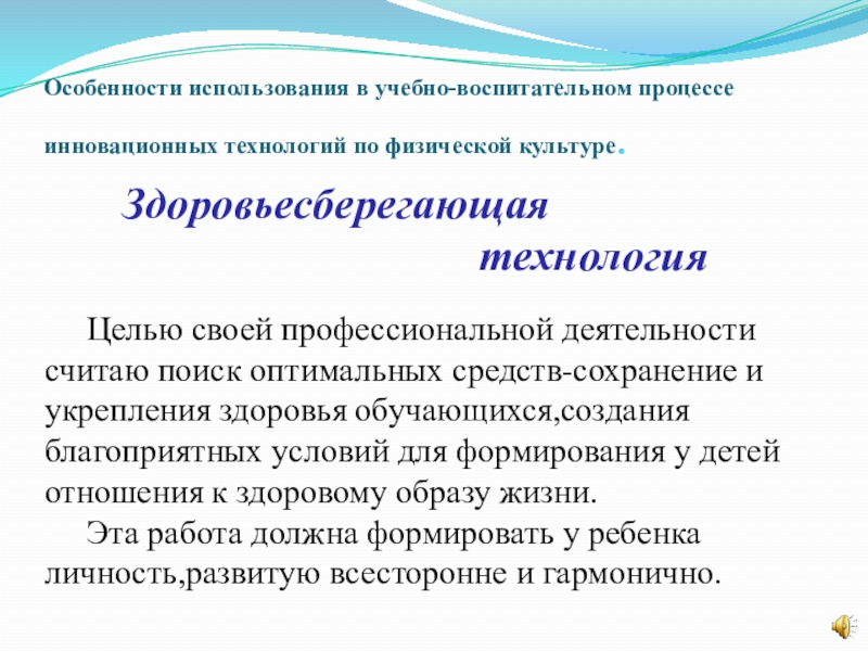 Целью своей профессиональной деятельности считаю поиск оптимальных средств-сохранение и укрепления здоровья обучающихся,создания благоприятных условий для формирования у детей отношения к здоровому образу жизни.
