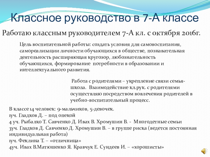 Работа с родителями – укрепление связи семья- школа. Взаимодействие кл.рук. с родителями осуществляю посредством вовлечения родителей в учебно-воспитательный процесс.