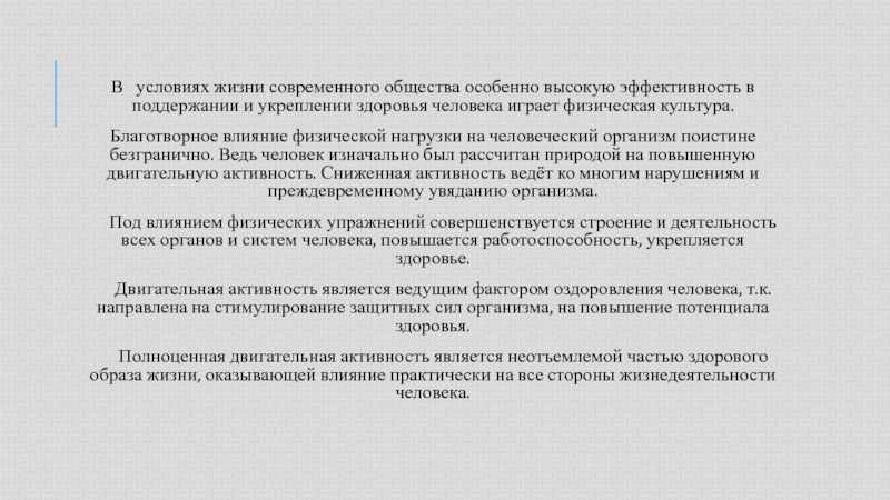 Полноценная двигательная активность является неотъемлемой частью здорового образа жизни, оказывающей влияние практически на все стороны жизнедеятельности человека.