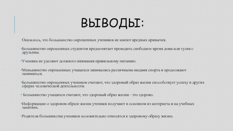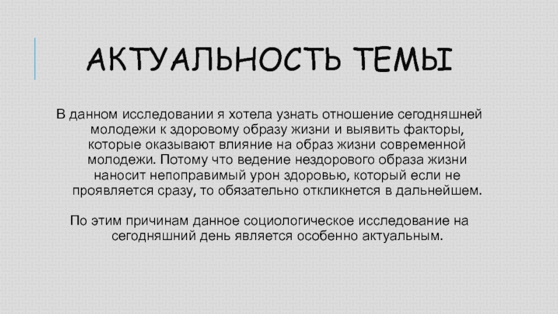 здоровому образу жизни и выявить факторы, которые оказывают влияние на образ жизни современной молодежи. Потому что ведение нездорового образа жизни наносит непоправимый урон здоровью, который если не проявляется сразу, то обязательно откликнется в дальнейшем.