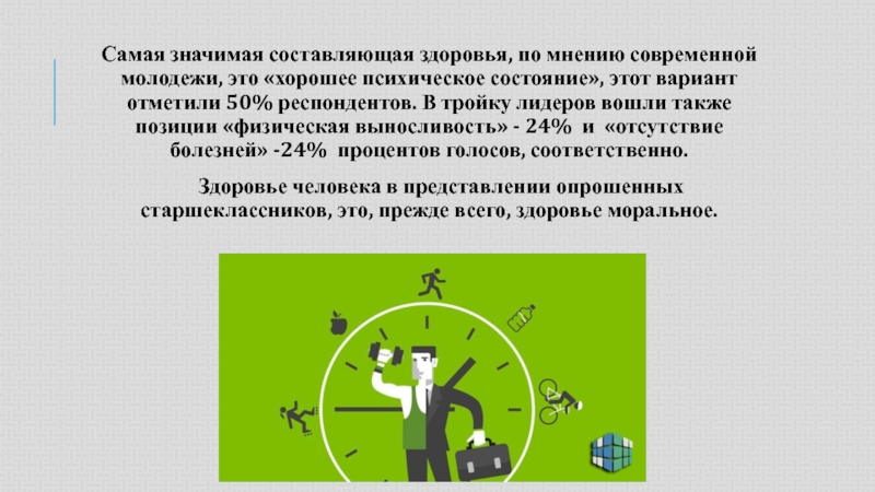 Слайд 15Самая значимая составляющая здоровья, по мнению современной молодежи, это «хорошее психическое