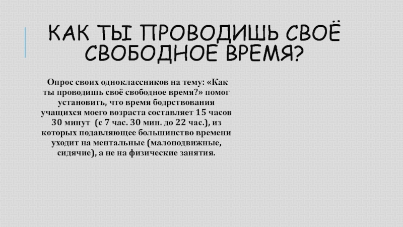 «Как ты проводишь своё свободное время?» помог установить, что время бодрствования учащихся моего возраста составляет 15 часов 30 минут (с 7 час. 30 мин. до 22 час.), из которых подавляющее большинство времени уходит на ментальные (малоподвижные, сидячие), а не на физические занятия.