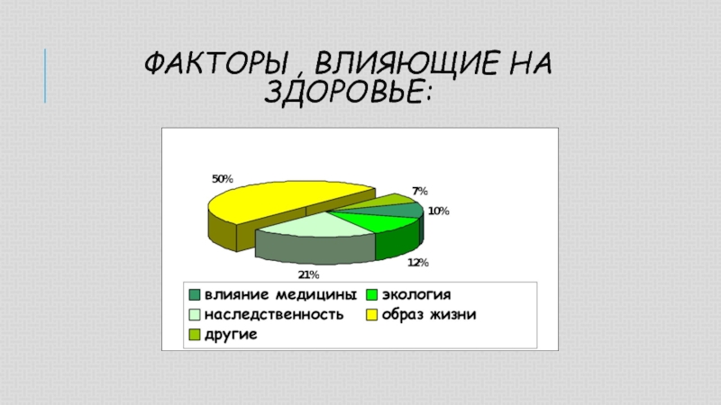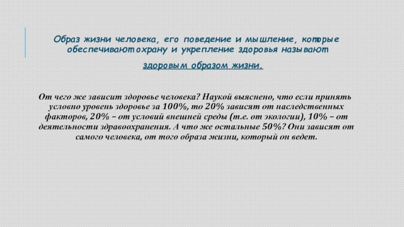 От чего же зависит здоровье человека? Наукой выяснено, что если принять условно уровень здоровье за 100%, то 20% зависят от наследственных факторов, 20% – от условий внешней среды (т.е. от экологии), 10% – от деятельности здравоохранения. А что же остальные 50%? Они зависят от самого человека, от того образа жизни, который он ведет.