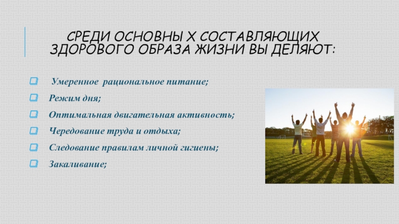 Слайд 4Среди основных составляющих здорового образа жизни выделяют: