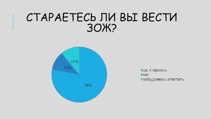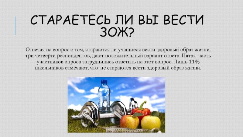 учащиеся вести здоровый образ жизни, три четверти респондентов, дают положительный вариант ответа. Пятая часть участников опроса затруднились ответить на этот вопрос. Лишь 11% школьников отмечают, что не стараются вести здоровый образ жизни.